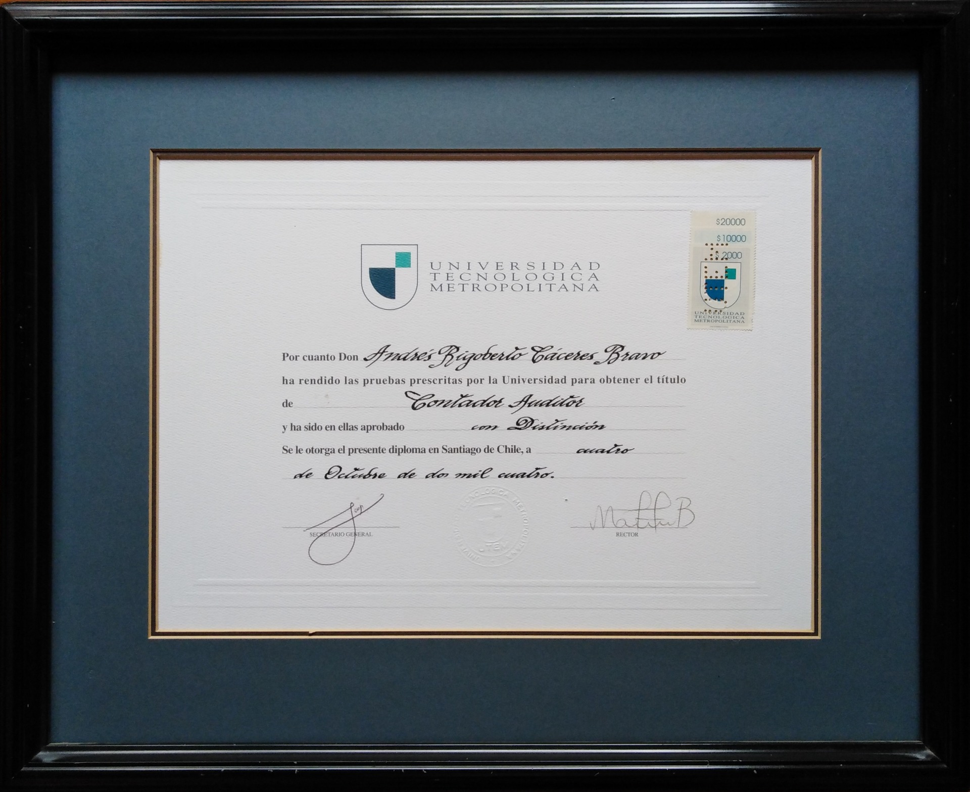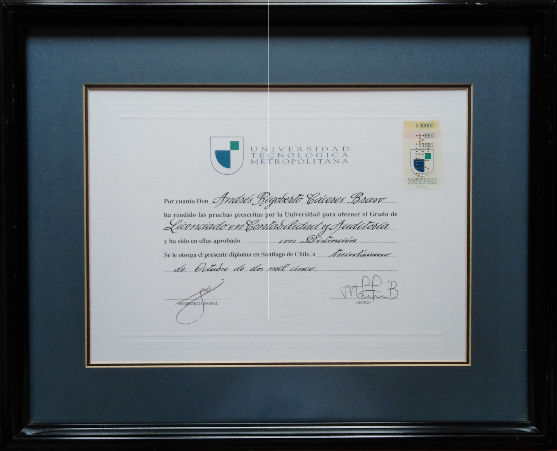 Grado Académico de Licenciado en Contabilidad y Auditorias, egresado con distinción en año 2005